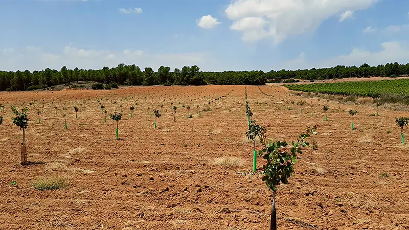 Aquí se está gestando lo que probablemente supondrá, a medio plazo, un cambio significativo en los paisajes agronómicos, que contrastarán con las grandes extensiones de vid y los cultivos de almendros y olivos. Este cambio apunta al cultivo del pistachero (Pistacia vera L.), perdido y desconocido desde tiempos de la presencia árabe en la Península ibérica y recuperado recientemente para deleite de nuestros paladares y beneficio de nuestra salud; y como punta de lanza de la sostenibilidad de los cultivos agrícolas en equilibrio con su entorno.
